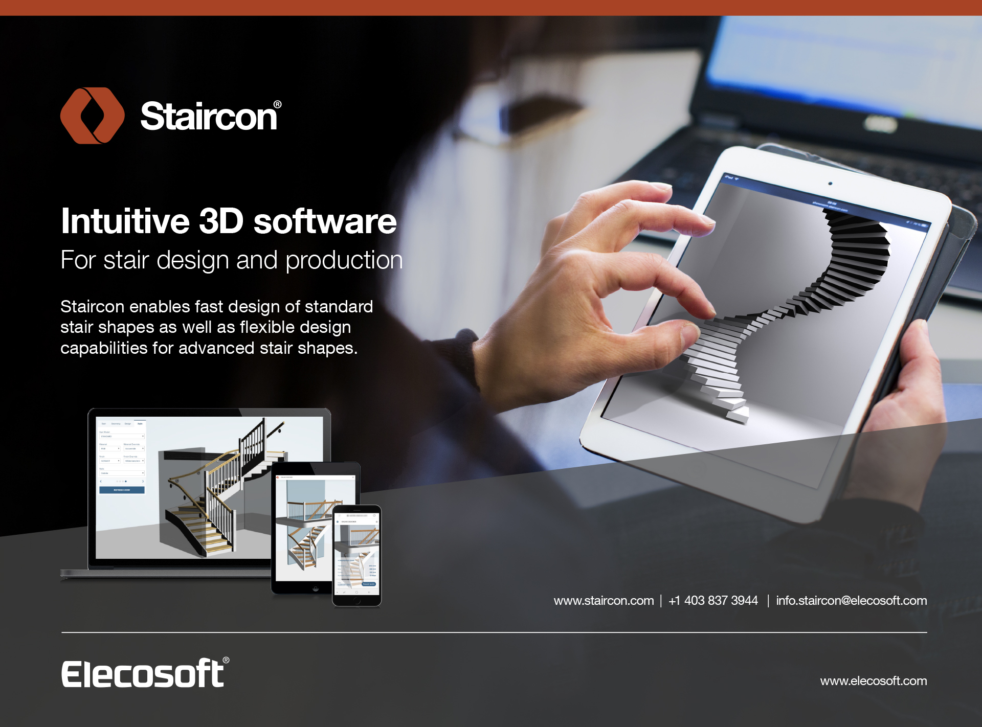 Staircon 3D CAD/CAM Software for Stair Design and Production. Staircon, from Elecosoft, provides a simplified and cost effective solution for stair builders. The powerful and user-friendly software enables fast design and production detail for Straight, Curved or Winder Staircases including unlimited custom design and production capabilities. We provide a specialised CAD/CAM solution where the 3D model with a few simple clicks will automatically generate production drawings, bill of materials, production list, pricing and CNC codes. Staircon is offered in different license levels with feature-sets ranging from web-based presentation to advance CAM-production. All licenses have same 3D design features, the only difference is regarding the production data you can generate with the software. More information about Elecosoft (250 employees worldwide): www.Elecosoft.com. More information about Staircon software: www.Staircon.com.
